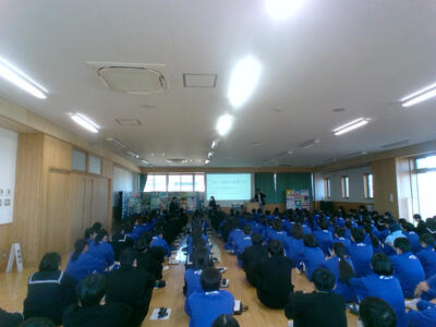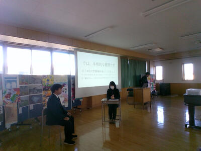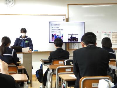 小学生の中学生に対する疑問をクイズ形式で説明しました。中学校のことを知ったり、先輩のことを知ったりして、小学生が安心して入学できるように工夫しています。司会進行も全て生徒が担当しています。