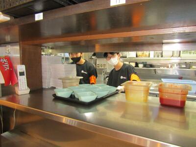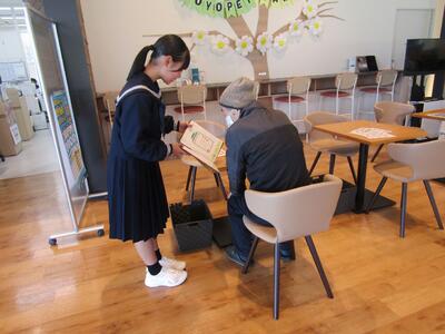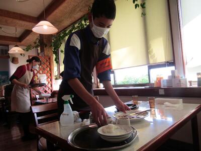 「わくわくチャレンジ」2日目の様子です。初日に比べて働くことへの不安が減ったのか、積極的に事業所の子どもたちに関わったりや自身の仕事をこなしたりする様子が多く見られました。接客では事業所の方だけでなくお客様にも温かく見守っていただけて嬉しく思います。残り3日間で、生徒自身の成長につながるように頑張ってほしいと思います。