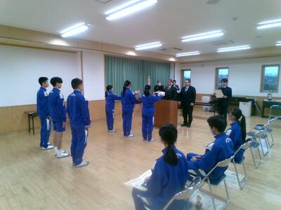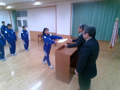 表彰対象は、陸上部、バスケットボール部、柔道部、野球部、駅伝部、合唱部、税についての作文表彰者、人権作文コンテスト表彰者でした。